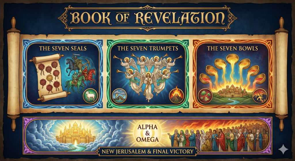 It’s the Book of Revelation, or as the original King James Version published in 1611 reads, The Revelation of St. John the Divine. Revelation indicates a single revelation that begins in Revelation 4:1 and lasts until the end of the book.