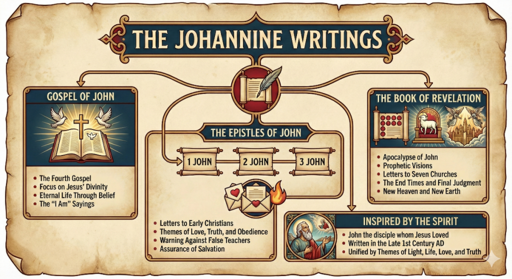 Throughout John’s writings, we find themes of love, keeping ourselves pure from the world’s influences, loving Jesus first, and walking in unity. We know that Jesus is the Word from the beginning of both the Gospel of John and 1 John. The seven “I AM” statements of Jesus (I am the Light, I am the Life, I am the Way, the Truth, etc.) are found only in the Gospel of John. The best teaching on the Holy Spirit as our Comforter and Helper is found in John 14-16, and the Book of Revelation is the most controversial yet hopeful book ever written.